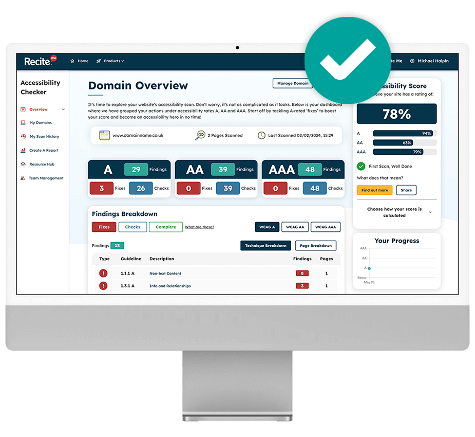 The Recite Me Accessibility Checker can be used to perform a scan of your website, fix any issues found, track your progress and download a shareable report. Some of the main benefits of using our checker include: