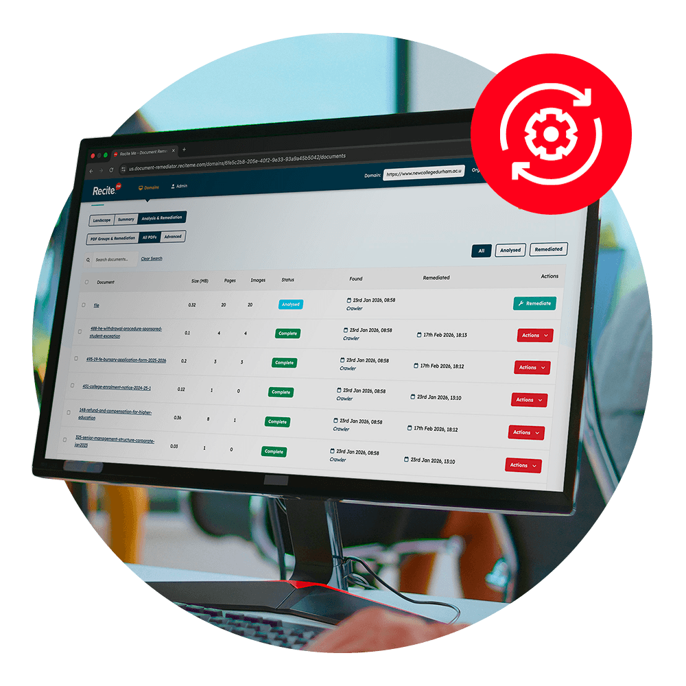 The Recite Me PDF Accessibility Checker scans, analyses, and remediates inaccessible PDF documents quickly and efficiently. It identifies common accessibility barriers that prevent users with disabilities from accessing content. Common examples include missing tags, incorrect reading order, and poor document structure.